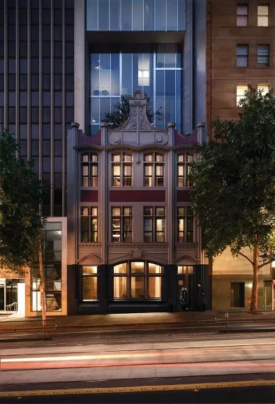 The site included a three-storey 1908 Art Nouveau building. The tower is sensitively setback from the heritage façade, reinstating the decorative grandeur of the original features and creating a landmark building, both at street level and on the skyline.