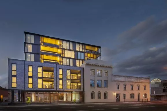 This 7-storey mixed use development comprises 31 high-end apartments on top of two levels of workplace and dining, including the new Sarah Sands Hotel. The corner facade dates to 1854 when the original Sarah Sands Hotel opened.