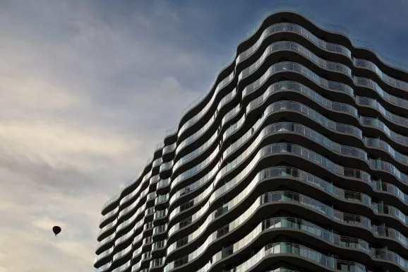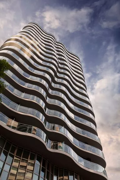 There are two street-level retail tenancies and above there are 282 apartments over 19 levels. Penthouse-style three-bedroom apartments sit atop the building. Curving, glazed balconies wrap the tower, giving it its striking form and creating a sense of great transparency and lightness.